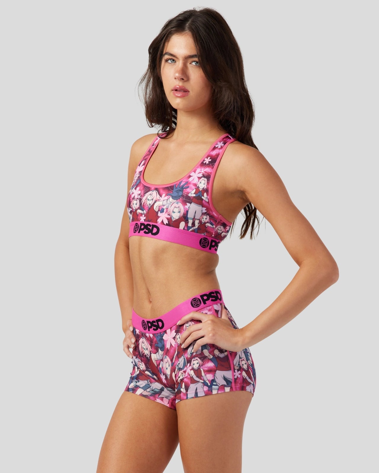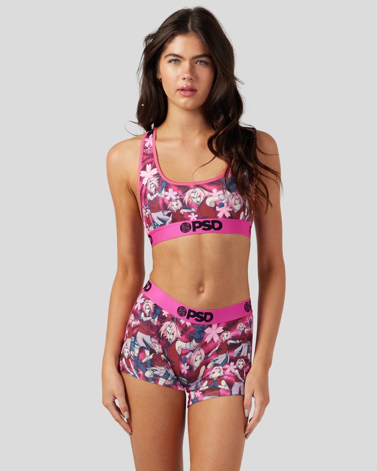 Introducing the newest drop from Naruto x PSD. The Sakura Clone Sports Bra features Sakura Haruno ready for battle along with cherry blossoms and a tie-dye background. Made with our silky poly blend. this bra is breathable yet slightly compressive. bringing you the comfort and support you need for everything you get into.